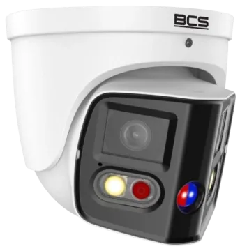 Kamera panoramiczna BCS-P-PEIP2X4FCR3L3-Ai1 serii BCS Point. Urządzenie posiada dwa obiektywy, każdy z ogniskową 2.8 mm, dzięki którym kąt widzenia urządzenia wynosi około 180° w poziomie. Kamera sprawdzi się w systemach monitoringu w dużych firm, w obiektach przemysłowych czy do pracy systemie “monitoringu miast”.